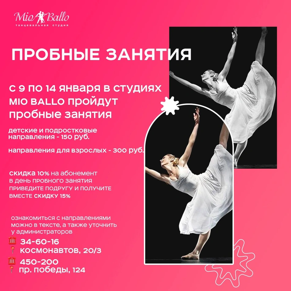 Спортивный клуб Mio Ballo предлагает широкий выбор занятий для всех возрастов и уровней подготовки. У нас есть фитнес-клуб, школа танцев, и мы находимся в городе Липецк. Режим работы клуба: понедельник-пятница с 09:00 до 22:00, суббота с 09:00 до 17:00. Здесь вы найдете все необходимое для заботы о своем теле и здоровье!
